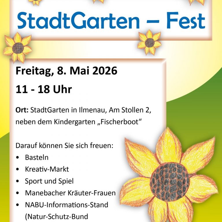 Herzliche Einladung zum StadtGarten-Fest mit Bastelangebot und Kreativ-Markt, dem Info-Stand des NABU, Sport- und Spielangebote und den Manebacher Kräuterfrauen. Für das leibliche Wohl ist bestens gesorgt!