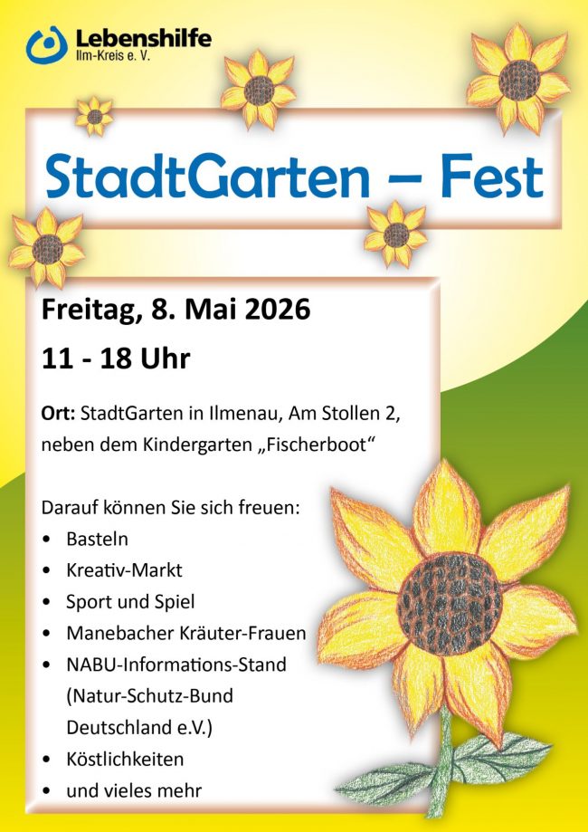 Herzliche Einladung zum StadtGarten-Fest mit Bastelangebot und Kreativ-Markt, dem Info-Stand des NABU, Sport- und Spielangebote und den Manebacher Kräuterfrauen. Für das leibliche Wohl ist bestens gesorgt!