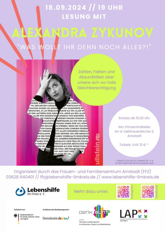 Alexandra Zykunov kommt nach ihrer ausverkauften Lesung 2022 erneut nach Arnstadt und liest aus ihrem zweiten Buch „Was wollt ihr denn noch alles?!“. Mittwochabend – 18. September 2024 – 19…