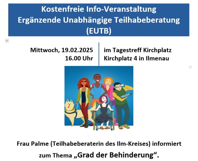 Am Mittwoch, den 11.12.24 informiert ab 16.00 Uhr die zuständige Beraterin des Ilm-Kreises, Frau Palme, über die Aufgaben und Tätigkeiten der Ergänzenden Unabhängigen Teilhabeberatung (EUTB). Diese Beratung richtet sich speziell…