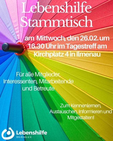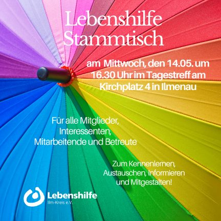 Am 14.05.25 um 16.30 Uhr findet der nächste Lebenshilfe-Stammtisch im Tagestreff am Kirchplatz 4 in Ilmenau statt. Zu dieser Gelegenheit ist es wieder möglich, sich auszutauschen, vielleicht auch neue Pläne…